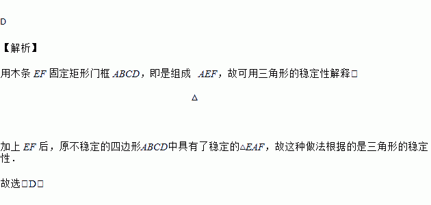 如图,工人师傅砌门时,常用木条EF固定门框ABCD,使其不变形,这种做法的根据是( )