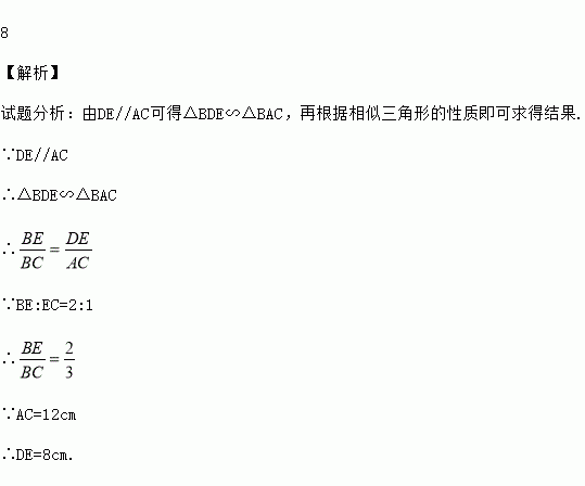 如图,DE//AC,BE:EC=2:1,AC=12cm,则DE=_________cm