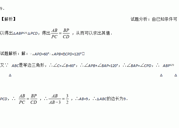 如图,在等边△ABC中,P为BC上一点,D为AC上一点,∠APD=60°,若BP=3,CD=2,求△ABC的边长.