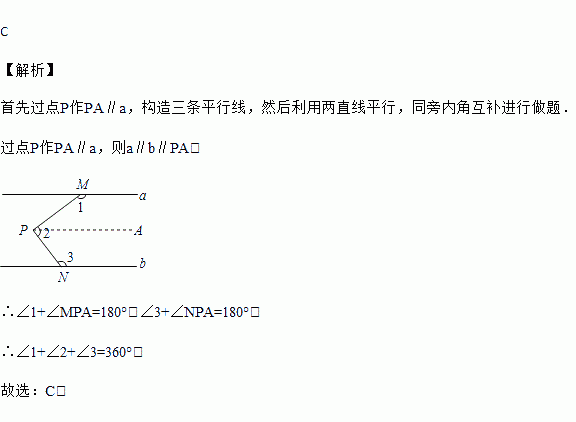 如图a∥b,M、N分别在a、b上,P为两平行线间一点,那么∠1+∠2+∠3=( )