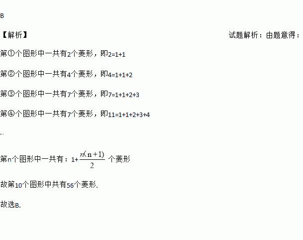 B 【解析】试题解析:由题意得: 第①个图形中一共有2个菱形,即2=1+1 第②个图形中一共有4个菱形,即4=1+1+2 第③个图形中一共有7个菱形,即7=1+1+2+3 第④个图形中一共有7个菱形,即11=1+1+2+3+4 ? 第n个图形中一共有:1+个菱形 故第10个图形中共有56个菱形. 故选B.