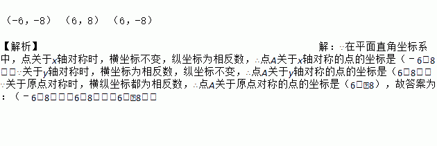 (-6,-8) (6,8) (6,-8) 【解析】【解析】 ∵在平面直角坐标系中,点关于x轴对称时,横坐标不变,纵坐标为相反数,∴点A关于x轴对称的点的坐标是(﹣6,8),∵关于y轴对称时,横坐标为相反数,纵坐标不变,∴点A关于y轴对称的点的坐标是(6,8),∵关于原点对称时,横纵坐标都为相反数,∴点A关于原点对称的点的坐标是(6,﹣8),故答案为:(﹣6,8),(6,8),(6,﹣8)....