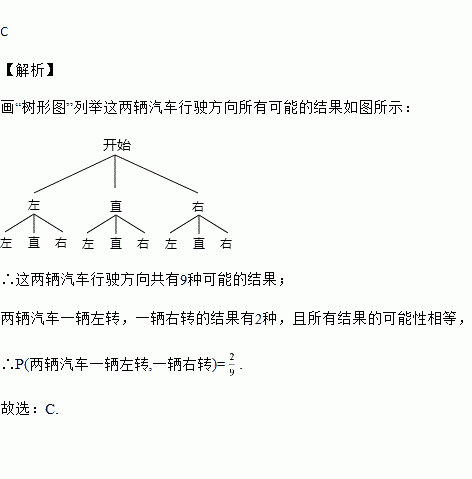 经过某十字路口的汽车,可能直行,也可能左转或者右转.如果这三种可能性大小相同,那么经过这个十字路口的两辆汽车一辆左转、一辆右转的概率是( )