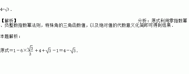 计算:(-π)0-6tan30°++|1-|.