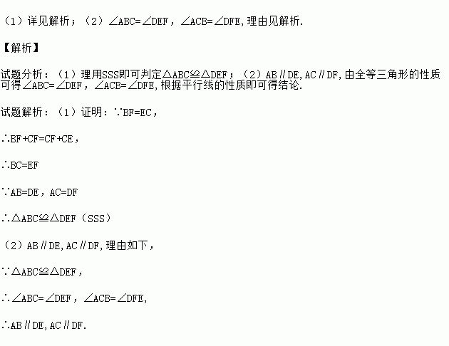 £¨1£©Ïê¼û½âÎö£»£¨2£©¡ÏABC=¡ÏDEF£¬¡ÏACB=¡ÏDFE,ÀíÓɼû½âÎö. ¡¾½âÎö¡¿ ÊÔÌâ·ÖÎö£º£¨1£©ÀíÓÃSSS¼´¿ÉÅж¨¡÷ABC¡Õ¡÷DEF£»£¨2£©AB¡ÎDE,AC¡ÎDF,ÓÉÈ«µÈÈý½ÇÐεÄÐÔÖʿɵáÏABC=¡ÏDEF£¬¡ÏACB=¡ÏDFE,¸ù¾ÝƽÐÐÏßµÄÐÔÖʼ´¿ÉµÃ½áÂÛ. ÊÔÌâ½âÎö£º£¨1£©Ö¤Ã÷£º¡ßBF=EC£¬ ¡àBF+CF=CF+CE£¬ ¡àBC=EF ¡ßAB=DE£¬AC=D...