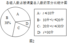 (3)在扇形统计图中,求表示A组(t≤10分)的扇形圆心角的度数;