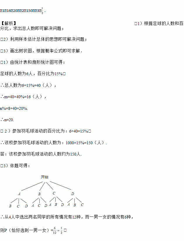 (2)若该校学生共有1000人,则该校参加羽毛球活动的人数约为________人;