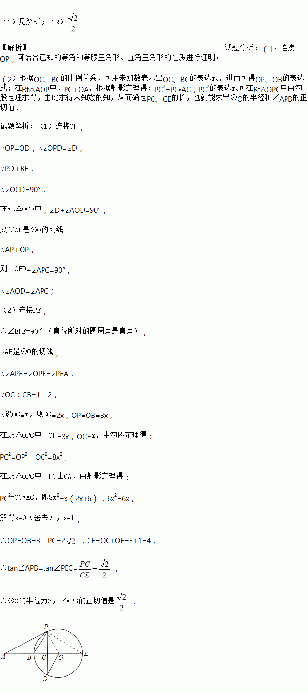 (2)若OC:CB=1:2,AB=6,求圆O的半径及tan∠APB.