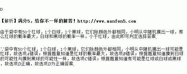 A. 一定是红球 B. 是红球或白球或黑球的可能性相同