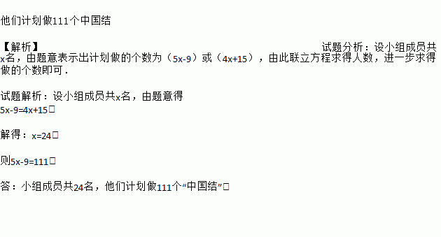 他们计划做111个中国结 【解析】试题分析:设小组成员共x名,由题意表示出计划做的个数为(5x-9)或(4x+15),由此联立方程求得人数,进一步求得做的个数即可. 试题解析:设小组成员共x名,由题意得 5x-9=4x+15, 解得:x=24, 则5x-9=111. 答:小组成员共24名,他们计划做111个“中国结”.