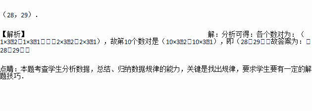 按下列规律排列的一列数对(1,2)、(4,5)、(7,8)、……,则第10个数对是___________.