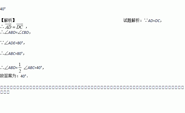 如图,四边形ABCD内接于圆,AD=DC,点E在CD的延长线上.若∠ADE=80°,则∠ABD的度数是________.