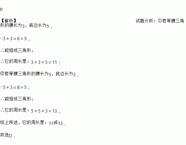 一个等腰三角形的两边长分别为3和5,则它的周长为( )