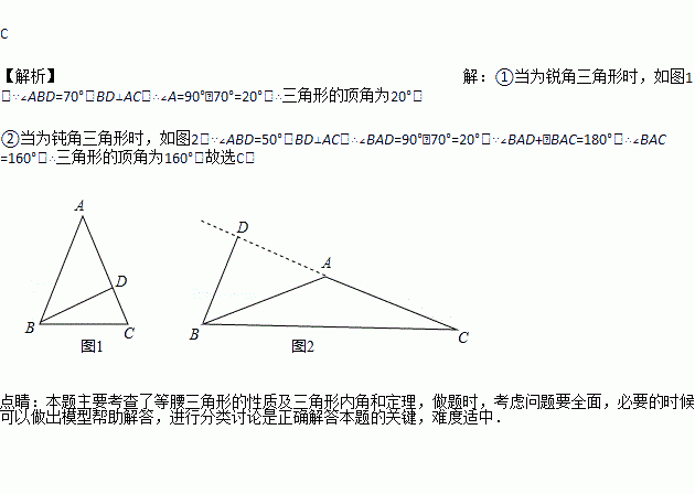 等腰三角形一腰上的高与另一腰的夹角为70°,则等腰三角形的顶角度数为( )