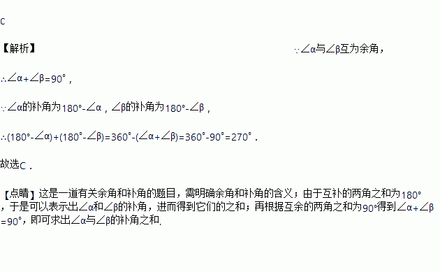 若∠α与∠β互为余角,则∠α的补角与∠β的补角之和为( )