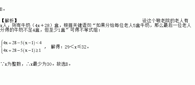 某校学生志愿服务小组在“学雷锋”活动中购买了一批牛奶到敬老院慰问老人.如果分给每位老人4盒牛奶,那么剩下28盒牛奶;如果分给每位老人5盒牛奶,那么最后一位老人分得的牛奶不足4盒,但至少1盒.则这个敬老院的老人最少有【 】