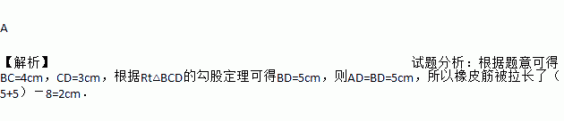 A 【解析】试题分析:根据题意可得BC=4cm,CD=3cm,根据Rt△BCD的勾股定理可得BD=5cm,则AD=BD=5cm,所以橡皮筋被拉长了(5+5)-8=2cm.