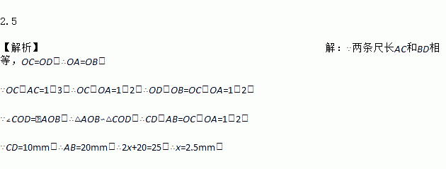 如图,已知零件的外径为25mm,现用一个交叉卡钳(两条尺长AC和BD相等,OC=OD)量零件的内孔直径AB.若OC:AC=1:3,量得CD=10mm,则零件的厚度x=_____mm.