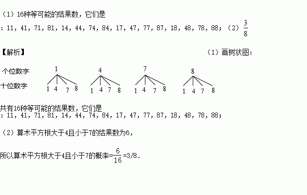 一袋中装有形状大小都相同的四个小球,每个小球上各标有一个数字,分别是1,4,7,8.现规定从袋中任取一个小球,对应的数字作为一个两位数的个位数;然后将小球放回袋中并搅拌均匀,再任取一个小球,对应的数字作为这个两位数的十位数.