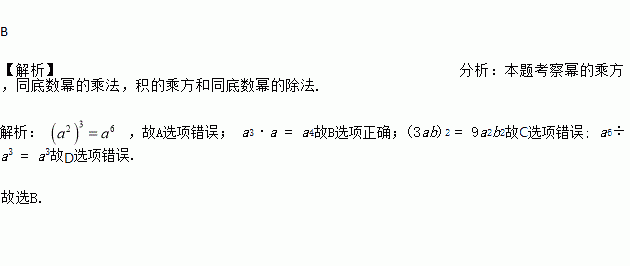 A. (a2)3 =a5 B. a3•a=a4 C. (3ab)2=6a2b2 D. a6÷a3 =a2