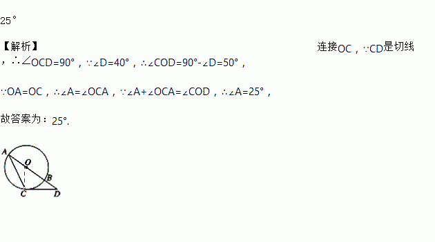如图,过⊙O上一点C作⊙O的切线,交⊙O直径AB的延长线于点D.若∠D=40°,则∠A的度数为______.