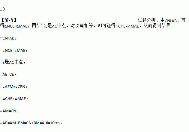如图,E点为△ABC的边AC的中点,CN∥AB,过E点作直线交AB于M点,交CN于N点,若MB=6cm,CN=4cm,则AB=__cm.