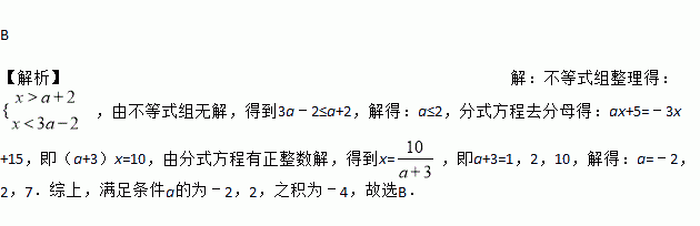 B 【解析】【解析】 不等式组整理得: ,由不等式组无解,得到3a﹣2≤a+2,解得:a≤2,分式方程去分母得:ax+5=﹣3x+15,即(a+3)x=10,由分式方程有正整数解,得到x=,即a+3=1,2,10,解得:a=﹣2,2,7.综上,满足条件a的为﹣2,2,之积为﹣4,故选B.