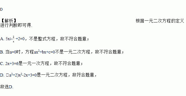 A. 5x2-+2=0 B. ax2+bx+c=0 C. 2x+3=6 D. (a2+2)x2-2x+3=0