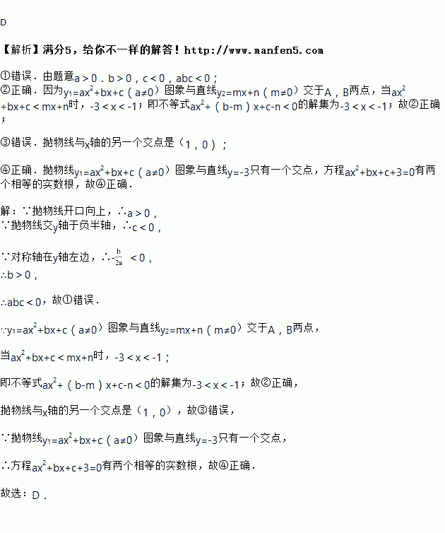 如图是抛物线y1=ax2+bx+c(a≠0)图象的一部分,其顶点坐标为A(﹣1,﹣3),与x轴的一个交点为B(﹣3,0),直线y2=mx+n(m≠0)与抛物线交于A,B两点,下列结论:①abc>0;②不等式ax2+(b﹣m)x+c﹣n<0的解集为﹣3<x<﹣1;③抛物线与x轴的另一个交点是(3,0);④方程ax2+bx+c+3=0有两个相等的实数根;其中正确的是( )
