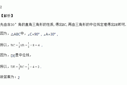 如图,△ABC中,已知AB=8,∠C=90°,∠A=30°,DE是中位线,则DE的长为_____.