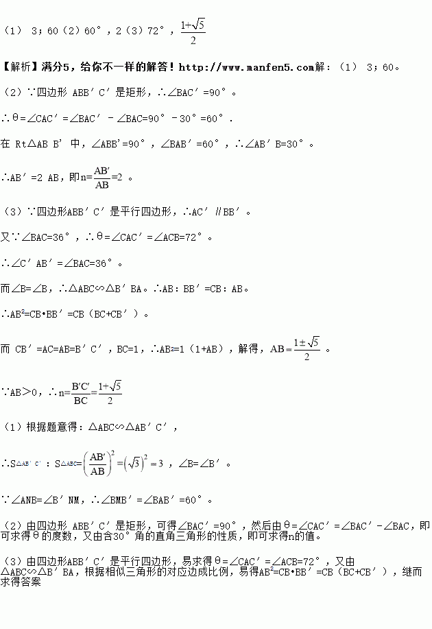 (3)如图③,△ABC中,AB=AC,∠BAC=36°,BC=l,对△ABC作变换[θ,n]得△AB′C′,使点B、C、B′在同一直线上,且四边形ABB'C'为平行四边形,求θ和n的值.