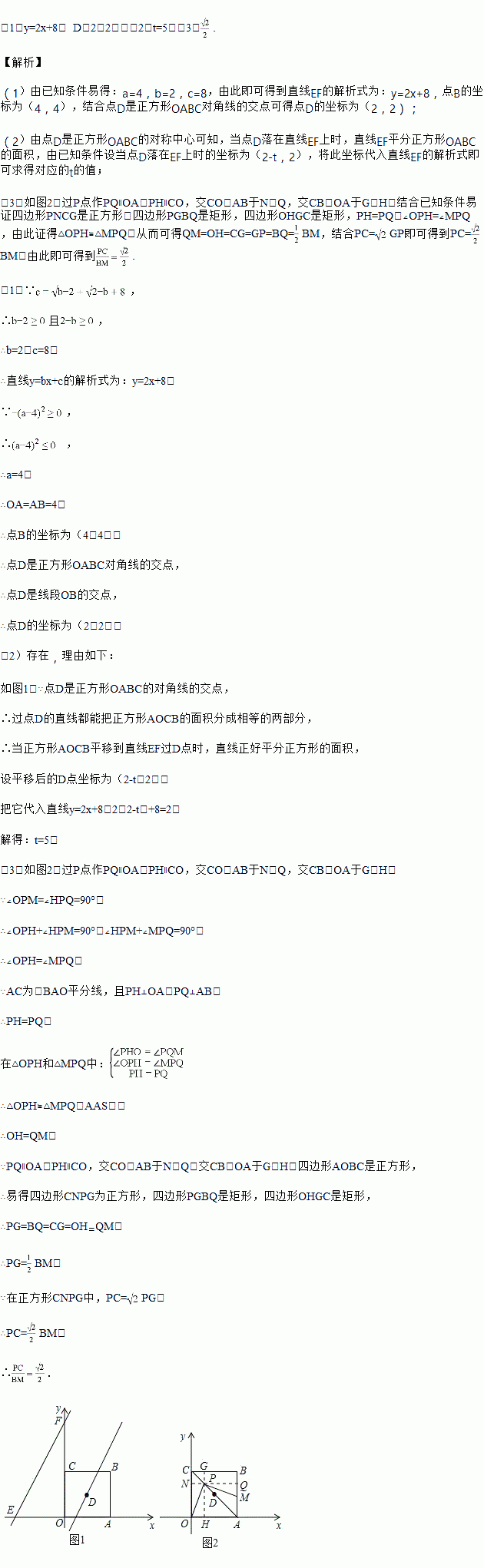 (2)若正方形OABC沿x轴负方向以每秒移动1个单位长度的速度平移,设平移的时间为t秒,问是否存在t的值,使直线EF平分正方形OABC的面积?若存在,请求出t的值;若不存在,请说明理由;