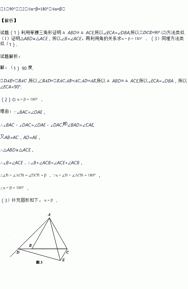 ②如图3,当点D在线段CB的延长线上,∠BAC≠90°时,请将图3补充完整,并直接写出此时α与β之间的数量关系(不需证明)