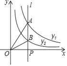 如图,直线l⊥x轴于点P,且与反比例函数y1=(x>0)及y2=(x>0)的图象分别交于点A,B,连接OA,OB,已知△OAB的面积为2,则k1﹣k2的值为( )