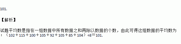某学习小组有8人,在一次数学测验中的成绩分别是:102,115,100,105,92,105,85,104,则他们成绩的平均数是_____________.