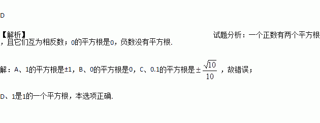 C. 0.01是0.1的一个平方根 D. 1是1的一个平方根