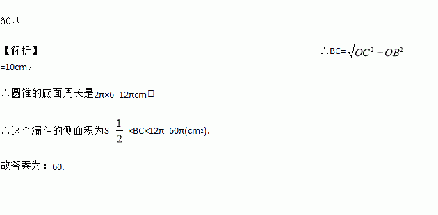 在综合实践活动课上,小明同学用纸板制作了一个圆锥形漏斗模型.如图所示,它的底面半径OB=6cm,高OC=8cm.则这个圆锥漏斗的侧面积是_______cm2.