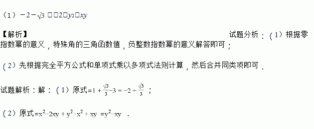 (1) 计算:20180-tan30°+(﹣)-1 ; (2)化简: (x-y)2-x (x-y)