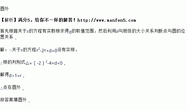 已知⊙O的半径为1,点P与点O之间的距离为d,且关于x的方程x2-2x+d=0没有实数根,则点P在______(填“圆内”“圆上”或“圆外”).