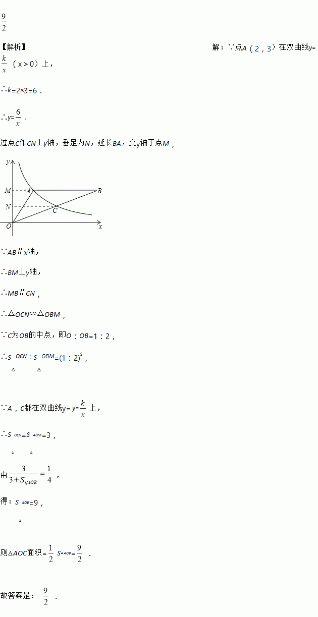 (x>0)经过△OAB的顶点A和OB的中点C,AB∥x轴,点A的坐标为(2,3),求△OAC的面积是________.