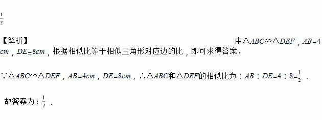 若△ABC∽△DEF,AB=4 cm,DE=8 cm,则△ABC与△DEF的相似比为________.