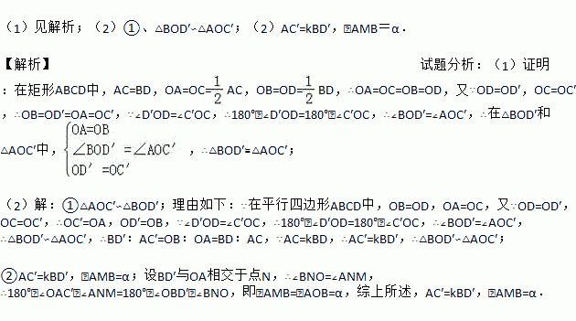 (1)见解析;(2)①、△BOD′∽△AOC′;(2)AC′=kBD′,∠AMB=α. 【解析】试题分析:(1)证明:在矩形ABCD中,AC=BD,OA=OC=AC,OB=OD=BD,∴OA=OC=OB=OD,又∵OD=OD′,OC=OC′,∴OB=OD′=OA=OC′,∵∠D′OD=∠C′OC,∴180°﹣∠D′OD=180°﹣∠C′OC,∴∠BOD′=∠AOC′,∴在△BOD′和△AOC...