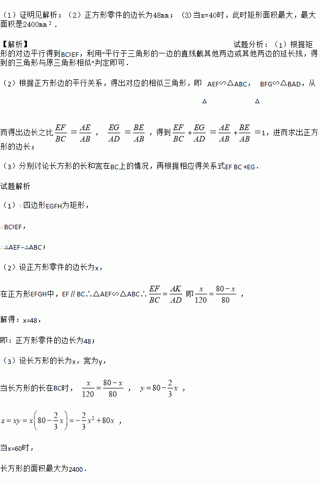 (3)如果把它加工成矩形零件如图2,当EG宽为多少mm时,矩形有最大面积,最大面积是多少?