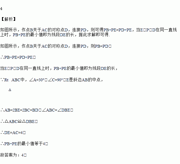 如图,在Rt△ABC中,∠A=30°,∠C=90°,E是斜边AB的中点,点P为AC边上一动点,若Rt△ABC的直角边AC=4,则PB+PE的最小值等于_____.