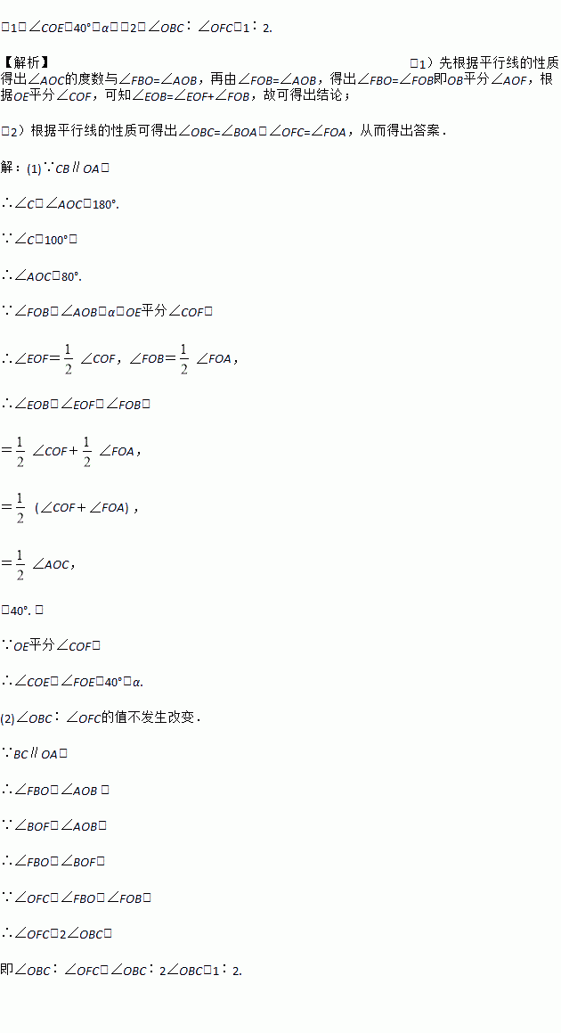 (1)∠COE=40°-α;(2)∠OBC∶∠OFC=1∶2. 【解析】(1)先根据平行线的性质得出∠AOC的度数与∠FBO=∠AOB,再由∠FOB=∠AOB,得出∠FBO=∠FOB即OB平分∠AOF,根据OE平分∠COF,可知∠EOB=∠EOF+∠FOB,故可得出结论; (2)根据平行线的性质可得出∠OBC=∠BOA,∠OFC=∠FOA,从而得出答案. 【解析】 (1)∵CB...