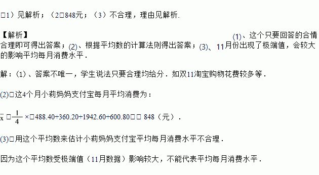 (3)用(2)中求得的平均数来估计小莉妈妈支付宝2018年平均每月消费水平,你认为合理吗?为什么?