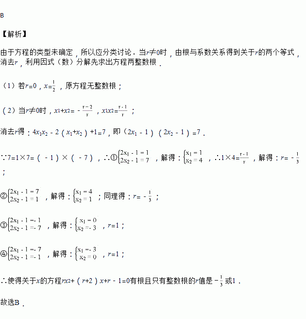 关于x的方程rx2+(r+2)x+r﹣1=0有根只有整数根的一切有理数r的值有( )个.