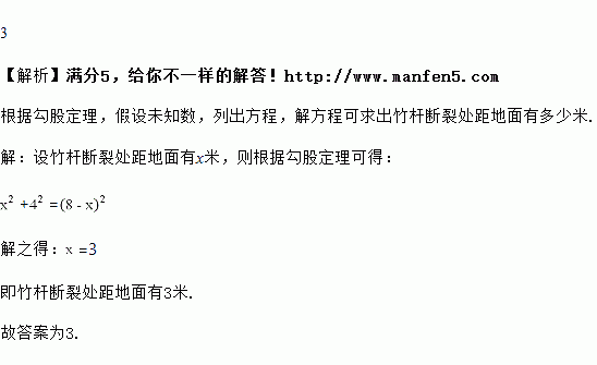 如图,一根长8m的竹杆在某处断裂,竹杆顶部抵着地面,且距竹杆底部4米,此时竹杆断裂处距地面有_____ m.