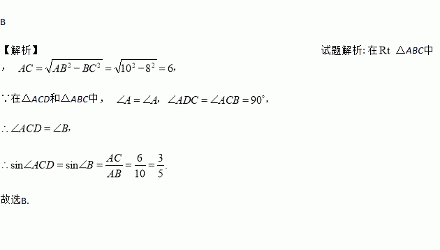如图,CD是Rt△ABC斜边AB边上的高,AB=10cm,BC=8cm,则sin∠ACD=( )