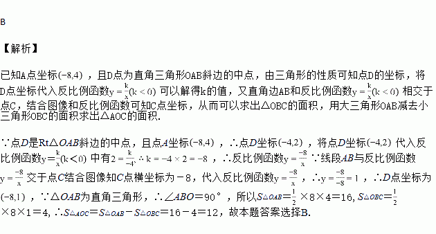 如图,已知双曲线y=(k<0)经过直角三角形OAB斜边OA的中点D,且与直角边AB相交于点C.若点A的坐标为(﹣8,4),则△AOC的面积为( )
